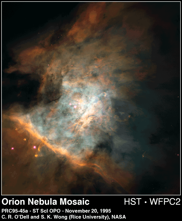 La Gran Nebulosa de Orión es una de las nebulosas astronómicas más interesantes que se conocen. Aquí se han fusionado quince imágenes del Telescopio Espacial Hubble para mostrar la gran extensión y la naturaleza diversa de la nebulosa. Además de albergar un brillante cúmulo abierto de estrellas conocido como el Trapecio, la Nebulosa de Orión contiene numerosas guarderías estelares. Estas guarderías contienen gas de hidrógeno, estrellas jóvenes y calientes, proplides y chorros estelares que expulsan material a altas velocidades. Gran parte de la estructura filamentosa visible en esta imagen son en realidad ondas de choque: frentes donde el material en rápido movimiento se encuentra con gas en movimiento lento. Algunas ondas de choque son visibles cerca de una de las estrellas brillantes en la parte inferior izquierda de la imagen. La Nebulosa de Orión está ubicada en el mismo brazo espiral de nuestra Galaxia que nuestro Sol. La luz tarda aproximadamente 1500 años en llegarnos desde allí.