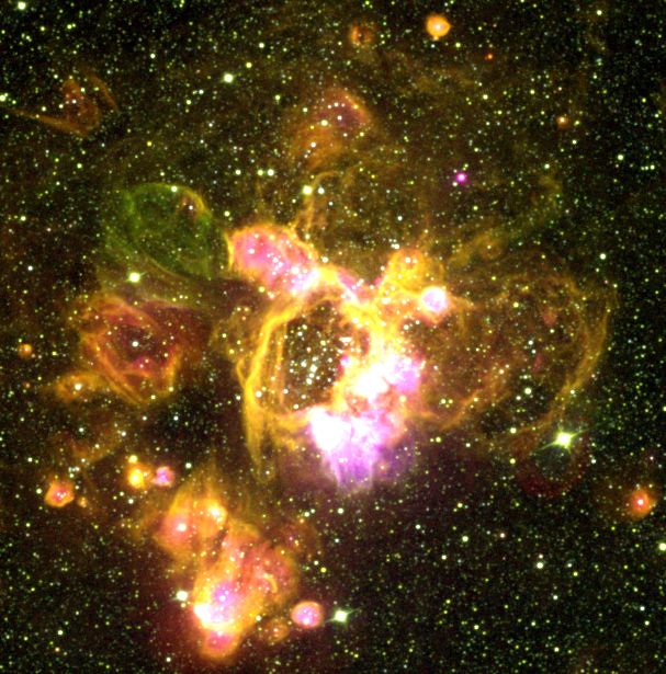 ¿Por qué hay un agujero en el centro de esta nebulosa? La explicación más aceptada es que ha sido causado por los vientos estelares de las estrellas que residen en ella. Las estrellas —incluido el Sol— expulsan electrones, protones y otros iones cargados en un flujo continuo denominado viento estelar. Estos iones empujan hacia fuera el hidrógeno y helio neutros que brillan en la nebulosa. Esta región de formación estelar se encuentra en la Gran Nube de Magallanes. La imagen es una composición de tres fotografías independientes, cada una sensible a un único color de luz, color que permite identificar un elemento químico específico. Actualmente se desconoce la razón por la que las estrellas emiten viento estelar.