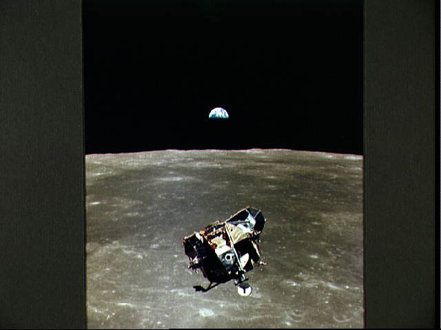 El 21 de julio de 1969, los astronautas del Apolo 11 Neil A. Armstrong y Edwin E. "Buzz" Aldrin Jr. despegaron de la superficie lunar en la etapa de ascenso de su módulo lunar denominado "The Eagle", tras haberse convertido en las primeras personas en caminar sobre la Luna. En la imagen, el Eagle asciende hacia un encuentro orbital con el Módulo de Comando en órbita, pilotado por Michael Collins. La oscura y lisa región de mar lunar visible en la superficie inferior es el Mare Smithii, ubicado justo por debajo del ecuador en el extremo oriental del lado visible de la Luna. La Tierra aparece suspendida sobre el horizonte occidental de la Luna.