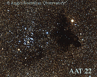 Did you ever feel like a black cloud was following you around? Well don't feel bad - this even happened to the bright young stars of the open cluster NGC 6520. On the left are the cluster's bright blue stars. They formed only millions of years ago - much more recently than our ancient Sun which formed billions of years ago. On the right is an absorption nebula from which the stars might have formed. This nebula contains much opaque dust which blocks visible light from the many stars that would have been seen in the background. The study of open clusters is valuable for many reasons which include the understanding star formation and the calibration of the distance scale of our universe. Information: Thursday, September 26 - A Total Lunar Eclipse