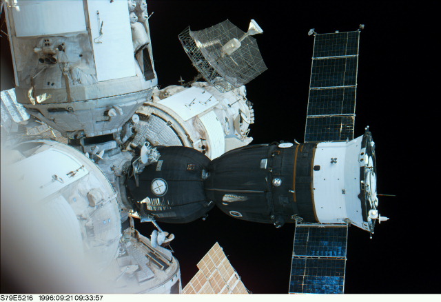 En la imagen se observa una cápsula rusa Soyuz tripulada por tres personas, con paneles solares en forma de alas desplegados, acoplada a la estación espacial Mir. En ruso, soyuz significa «unión», y de hecho uno de los hitos alcanzados por una nave Soyuz fue la unión orbital con un módulo de mando Apollo estadounidense durante la primera misión espacial internacional (Apollo-Soyuz) en 1975. Las naves Soyuz TM están especialmente modificadas para su uso con la Mir, tanto como transbordadores de cosmonautas y astronautas como en calidad de botes salvavidas en caso de necesidad. Esta imagen fue tomada con una cámara fotográfica electrónica por la tripulación del Transbordador Espacial Atlantis durante su última visita a la Mir, con el propósito de recoger a la astronauta Shannon Lucid y dejar a bordo a John Blaha.