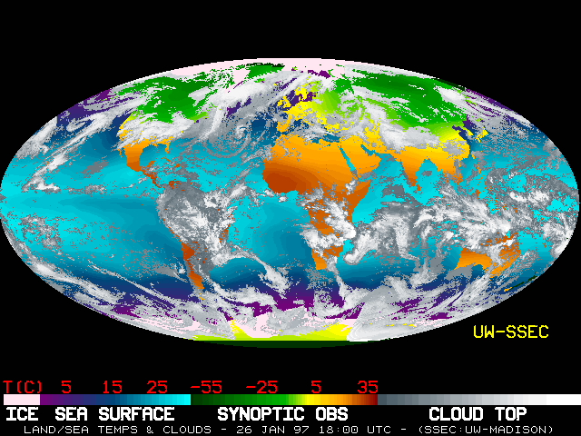 What's the temperature outside? No matter where you are on Earth, the above map can tell you. This global montage was created using the temperature data from numerous satellites orbiting the Earth. This map indicates temperatures recorded early on January 26th, 1997, but an even more recent map -- updated every 6 hours -- is usually available. For ocean colors on the map, lighter shades of blue indicate warmer temperatures, while for the land, red hues indicate relative warmth. Just looking at the map one can see that summer warms Earth's southern hemisphere, while winter chills Earth's northern hemisphere. The key at the bottom lists temperatures in degrees Centigrade that can be easily converted to degrees Fahrenheit.