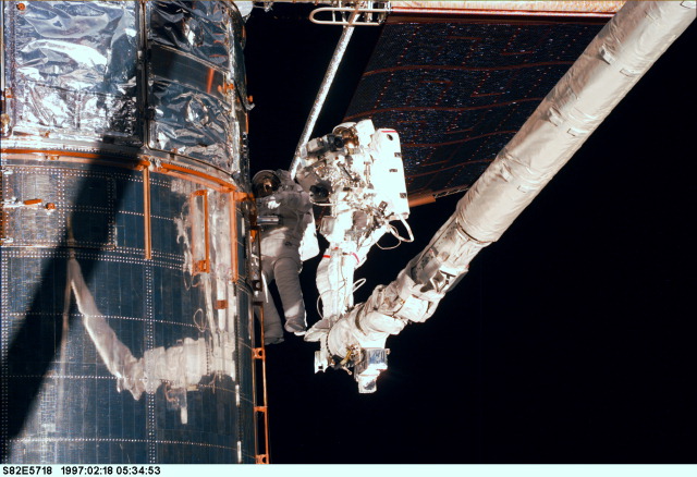 La segunda misión de mantenimiento del Telescopio Espacial Hubble ha sido completada. Cada pocos años, el telescopio es visitado por un transbordador espacial para permitir a los astronautas reemplazar instrumentos antiguos por nuevos. En esta ocasión, el Espectrógrafo de Alta Resolución Goddard y el Espectrógrafo de Objetos Tenues fueron sustituidos por la Cámara de Infrarrojo Cercano y Espectrómetro de Objetos Múltiples, y por el Espectrógrafo de Imagen del Telescopio Espacial. Estos nuevos instrumentos actuarán como ojos que comparten el espejo de 2,4 metros del telescopio junto con los instrumentos restantes: la Cámara de Campo Amplio y Planetaria 2 y la Cámara de Objetos Tenues. El Telescopio Espacial Hubble puede obtener imágenes más nítidas que los telescopios terrestres porque sus imágenes no se ven distorsionadas por la atmósfera terrestre. Fotografiados en las fases finales de una caminata espacial correspondiente a la segunda misión de mantenimiento, los astronautas Mark Lee (derecha) y Steven Smith trabajan sobre el HST mientras están posicionados sobre el brazo manipulador remoto del transbordador.