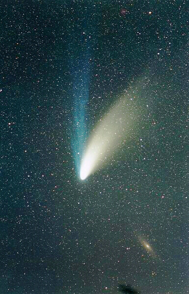 Which is closer: the comet or the galaxy? Answer: the comet. In its trek through the inner Solar System, Comet Hale-Bopp has passed nearly in front of the Andromeda Galaxy (M31), seen on the lower left. At the time of this picture, March 27th, Comet Hale-Bopp was about 10 light-minutes from the Earth, while M31 remained about 3 million light-years distant. By contrast, light can cross the Earth in about 1/20th of a second, and light takes about one second to reach Earth's Moon. Comet Hale-Bopp is one of the largest comets ever recorded, and although its' nucleus has never been photographed, it is estimated from brightness and spin measurements to be about 40 kilometers across. In contrast, Comet Halley in 1987 was measured to be 15 km, and Comet Hyakutake in 1996 was estimated to be no more than 10 km.