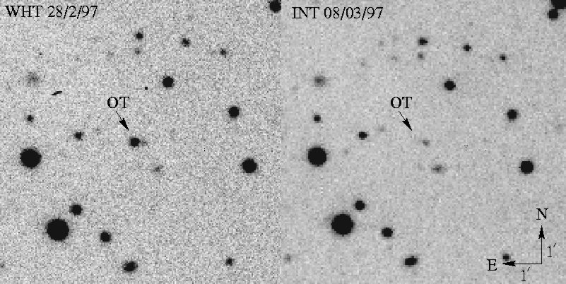 The largest telescopes in the world have scrambled to point toward this faint, fading object. Why? Because it may well be the first active optical counterpart ever found for a gamma-ray burst, and could hold the clue to the distance scale to this most enigmatic class of astronomical objects. During the past two months, multiwavelength observations, claims, and counterclaims have been exchanged at a torrential pace, as astronomers wait impatiently to see what setting houses the fading transient. Above are two pictures of the optical transient (OT), one taken on February 28th, the other about a week later on March 8th. The OT arrows show the source that faded from view during this time. The OT has been examined by large telescopes including the Hubble Space Telescope and Keck, yet researchers are still scrambling to get answers to fundamental questions about its true nature. Does the OT actually move (exhibit proper motion)? Is there a faint galaxy superposed behind the OT or is this extended emission fading too? In the face of intense scrutiny with the world's most capable telescopes, the origin of gamma-ray bursts so far remains mysterious!