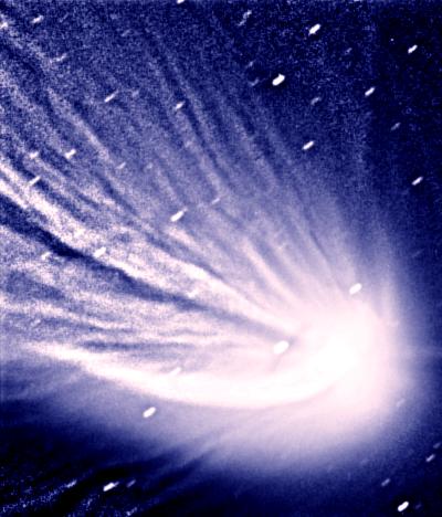 This enhanced composite image detailing structure in the coma and dust tail of Hale-Bopp was recorded May 5 - one day before the comet's passage from north to south across the plane of Earth's orbit. As the comet descends into murky twilight for northern hemisphere observers it will become increasingly easy to view from the south. Along with Southern Hemisphere observers, astronomers and a fleet of spacecraft of the International Solar-Terrestrial Physics program have been anxiously awaiting this north/south crossing. The comet's interaction with the changing equatorial solar wind and magnetic field during this crossing is expected to produce distortions and disconnections of Hale-Bopp's ion tail. Whisker-like structures, probably part of the ion tail, are visible above extending from the lower left of the bright coma.