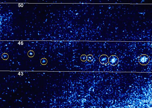 ¿Ocurren los relámpagos únicamente en la Tierra? Las naves espaciales de nuestro Sistema Solar han detectado señales de radio consistentes con relámpagos en otros planetas, incluyendo Venus, Júpiter, Saturno, Urano y Neptuno. En la fotografía anterior, los destellos ópticos de Júpiter fueron fotografiados recientemente por el orbitador Galileo. Cada uno de los puntos encerrados en círculos indica un relámpago. Los números señalan líneas de latitud. El tamaño del punto más grande es de aproximadamente 500 kilómetros de diámetro y podría corresponder a nubes altas iluminadas por varios destellos brillantes de relámpagos.