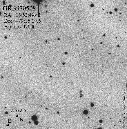 The GRB distance scale controversy may have just ended with a flash. Gamma Ray Bursts (GRBs) are powerful explosions occurring in seemingly random positions on the sky. They are so featureless and so poorly resolved, however, that their distances could not be determined. Last Thursday, May 8th, the orbiting Beppo-Sax Satellite detected and precisely located a GRB (GRB970508), quickly relaying its position to astronomers. Within hours, many of the world's most powerful telescopes were re-pointed in the direction of the new GRB. There they found a faint but variable optical source: a potential counterpart to the gamma-ray burst that was getting brighter. Most importantly, continued scrutiny showed that this optical transient had absorption lines with a redshift of about 0.8 - the distance scale of galaxies and quasars. If this source and GRB970508 are related, the GRB itself must be many billions of light-years away and the 30-year controversy on the distance scale to GRBs will draw dramatically to a close. GRBs could move from the realm of astronomical mystery to useful beacons of the early universe. Above is a "negative" image of the GRB970508 field, located near the north celestial pole, taken hours after the initial flash of gamma rays. The faint optical transient source is inside the box. North is up and the image is 2.5 arcminutes across (about a tenth the size of the full moon).