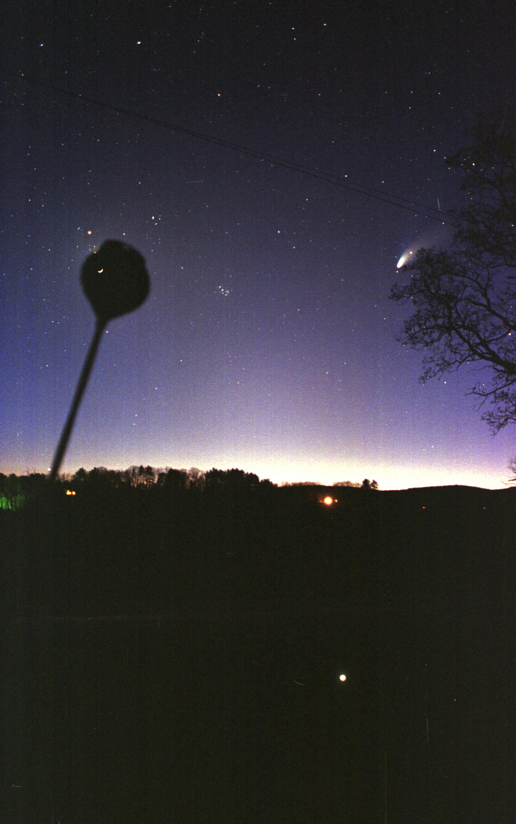 It was truly a busy sky. In one of the more spectacular photos yet submitted to Astronomy Picture of the Day, Don Cooke of Lyme, New Hampshire caught the Sun, Moon, Earth, night sky, Pleiades star cluster, and Comet Hale-Bopp all in one frame. The first leg of this "triple crown" exposure was of the Sun, taken at 6:55 pm on April 10th 1997. Through a dark filter, the Sun appears as the bright dot on the lower right of the image. A second filtered exposure was then taken after the Sun had set, one hour and 40 minutes later - this time featuring the Moon. The Moon appears as a crescent superimposed on an odd-shaped dark circle protruding into the left of the image. This shadow is actually a silhouette of a driveway reflector mounted on an aluminum rod used to block out the bright moon - so as to allow a third exposure, this time unfiltered, of the background night sky. And what a beautiful sky it is. Highlights include Comet Hale-Bopp, on the right, and the Pleiades star cluster, near the center. But what, you may wonder, is that bright light near the center of the picture? Don't worry if you can't guess: it's a porch light from a house across the river!