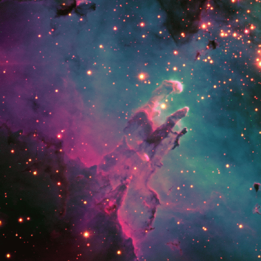 ¿Qué ilumina este castillo de formación estelar? La familiar Nebulosa del Águila brilla de manera similar a un letrero de neón, pero en muchos colores a la vez. La fotografía anterior es un compuesto de tres de estos colores de gas luminoso. En particular, el gas de azufre rojo brillante de la nebulosa delimita claramente algunos de los nudos de formación estelar más densos. La luz energética proveniente de jóvenes estrellas masivas hace que el gas brille y literalmente evapora parte del polvo y gas de su pilar de nacimiento. Muchas de estas estrellas explotarán después de varios millones de años, devolviendo la mayor parte de sus elementos a la nebulosa que las formó. Este proceso está dando origen a un cúmulo abierto de estrellas conocido como M16.