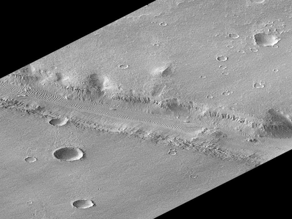 El Mars Global Surveyor alcanzó la órbita marciana el 11 de septiembre y comenzó el frenado aerodinámico para insertarse en su órbita de cartografía definitiva, un proceso que se extenderá hasta marzo del año próximo. Anticipando las labores que se avecinan, los operadores de la Cámara Orbital de Marte han comenzado a adquirir imágenes de prueba. Este dramático detalle de una imagen reciente muestra una franja de 16 kilómetros de ancho de un valle de las tierras altas, parte del sistema Nirgal Vallis. La imagen original fue registrada desde una altitud de 400 kilómetros con una resolución de aproximadamente 9 metros por píxel, y ha sido rotada para representar la perspectiva de la cámara. ¿Fueron estos valles formados por el flujo de agua, o fue el colapso y la erosión causados por aguas subterráneas lo que produjo el canal? ¿Qué otros procesos fueron importantes? El tiempo lo dirá. Desde su órbita de cartografía planificada, con una resolución cuatro veces mayor, las imágenes del Mars Global Surveyor deberían proporcionar respuestas a estas y otras preguntas sobre Marte.