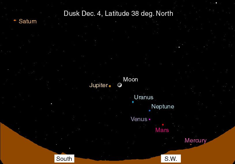 Mire hacia arriba esta noche. Justo después del atardecer, la luna creciente y los cinco planetas visibles a simple vista (Mercurio, Venus, Marte, Júpiter y Saturno) serán observables (dependiendo de su latitud), ubicados cerca del plano de la eclíptica de nuestro sistema solar. Venus y Júpiter brillarán intensamente como las "estrellas" más luminosas del cielo, pero Mercurio estará cerca del horizonte y será difícil de observar. Un par de binoculares también permitirá distinguir Urano y Neptuno, y los observadores con telescopio y un buen sitio de observación podrían incluso vislumbrar a Plutón, tenue, justo por encima del horizonte occidental en el crepúsculo menguante (no mostrado en el mapa superior). Disfrute de este hermoso espectáculo cualquier noche despejada hasta aproximadamente el 8 de diciembre. Se espera una reunión similar en mayo del año 2000, pero los planetas estarán ocultos a la vista por el resplandor solar. Un cielo nocturno tan lleno de planetas como este volverá a ocurrir... en aproximadamente 100 años.