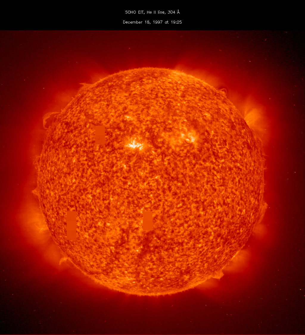 Hoy es el Solsticio de Invierno, el día más corto del año en el Hemisferio Norte. El ciclo anual de las estaciones en el planeta Tierra encuentra nuevamente al Sol en su punto más bajo en el cielo septentrional. El ciclo propio de actividad solar de 11 años avanza hacia un máximo que ocurrirá en 2000-2001. Esta imagen del Sol en la luz del Helio ionizado fue registrada por el observatorio espacial SOHO hace apenas tres días y muestra numerosas prominencias y regiones activas.