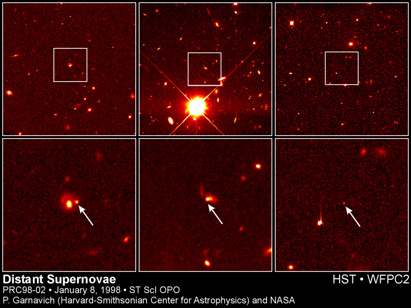 Al observar cómo las galaxias se alejan, los astrónomos observacionales del siglo XX descubrieron un hecho asombroso: el Universo se está expandiendo. ¿Continuará expandiéndose indefinidamente? La velocidad de la luz es finita, por lo que observar el Universo distante equivale a mirar hacia el pasado remoto. Estas tres imágenes del Telescopio Espacial Hubble muestran algunas de las supernovas más lejanas detectables —explosiones estelares ocurridas hace entre cinco y siete mil millones de años luz de distancia, antes de que se formara el Sol—. Según informes recientes, el brillo aparente y las velocidades de expansión asociadas a estas y otras supernovas distantes comienzan a sugerir que la tasa de expansión del Universo no se ha desacelerado, sino que ha aumentado con el tiempo, y que la expansión del Universo está destinada a continuar.