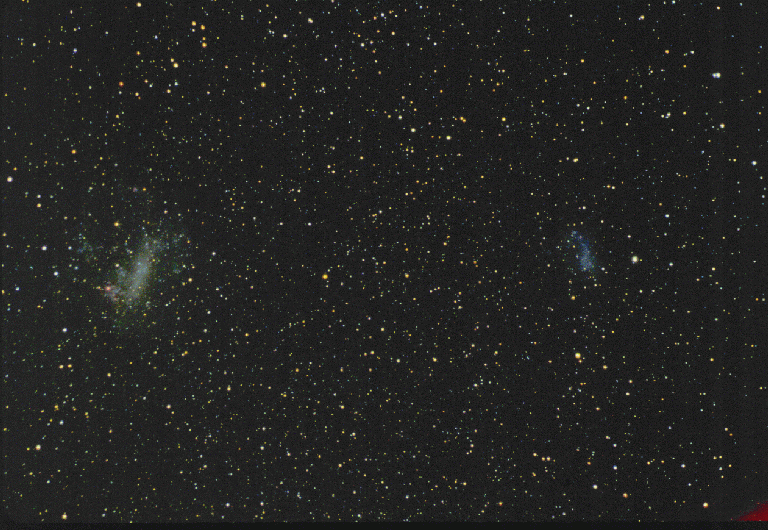 Dos galaxias destacan a los observadores casuales en el hemisferio sur de la Tierra: la Gran Nube de Magallanes (LMC, por sus siglas en inglés) y la Pequeña Nube de Magallanes (SMC). Estas galaxias irregulares son dos de las galaxias más cercanas a nuestra Vía Láctea. Observaciones recientes de la LMC (a la izquierda) han determinado que se encuentra en una órbita casi circular alrededor de nuestra Galaxia, y han contribuido incluso a determinar la composición de la materia oscura en ella. La fotografía abarca 40 grados. Visible en la parte inferior izquierda de la LMC se encuentra la Nebulosa de la Tarántula (en rojo). En primer plano, a la derecha de la SMC, se distingue el cúmulo globular 47 Tucanae, que aparece aquí como un punto brillante de luz.