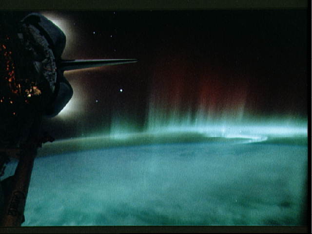 Un fondo de estrellas distantes, sinuosas y puntiagudas bandas de Luces Australes (Aurora Australis), y el tenue resplandor del plasma cargado (gas atómico ionizado) que rodea los motores del Transbordador Espacial Discovery confieren a esta fotografía de la misión STS-39 un aspecto inquietante y de otro mundo. Esta imagen refleja fielmente la misión de Discovery de abril de 1991: su bahía de carga útil (PLB, por sus siglas en inglés) estaba repleta de instrumentos diseñados para estudiar objetos celestes, auroras y fenómenos atmosféricos, así como el entorno de órbita terrestre baja alrededor de la propia PLB. Las auroras visibles en esta imagen se encuentran a una altura de aproximadamente 80 a 130 kilómetros. Las auroras son causadas por partículas cargadas del viento solar, canalizadas a través del campo magnético terrestre, que excitan las moléculas en la atmósfera superior.