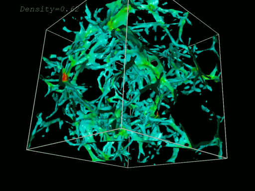 Vivimos en un bosque. Dispersos por todo el universo se encuentran "árboles" de gas hidrógeno que absorben la luz proveniente de objetos distantes. Estas nubes de gas dejan numerosas líneas de absorción en los espectros de cuásares lejanos, denominadas en conjunto el bosque Lyman-alfa. Los cuásares distantes parecen estar absorbidos por muchas más nubes Lyman-alfa que los cuásares cercanos, lo que indica la existencia de un espeso bosque Lyman-alfa en los primeros tiempos de nuestro universo. La imagen superior representa una posible recreación computacional de cómo estaban distribuidas las nubes Lyman-alfa a un corrimiento al rojo de 3. Cada lado del cubo mide 30 millones de años luz de longitud. Aún queda mucho por conocer sobre el bosque Lyman-alfa, incluyendo la geometría real y la extensión de las nubes, y por qué hoy en día existen muchas menos nubes.