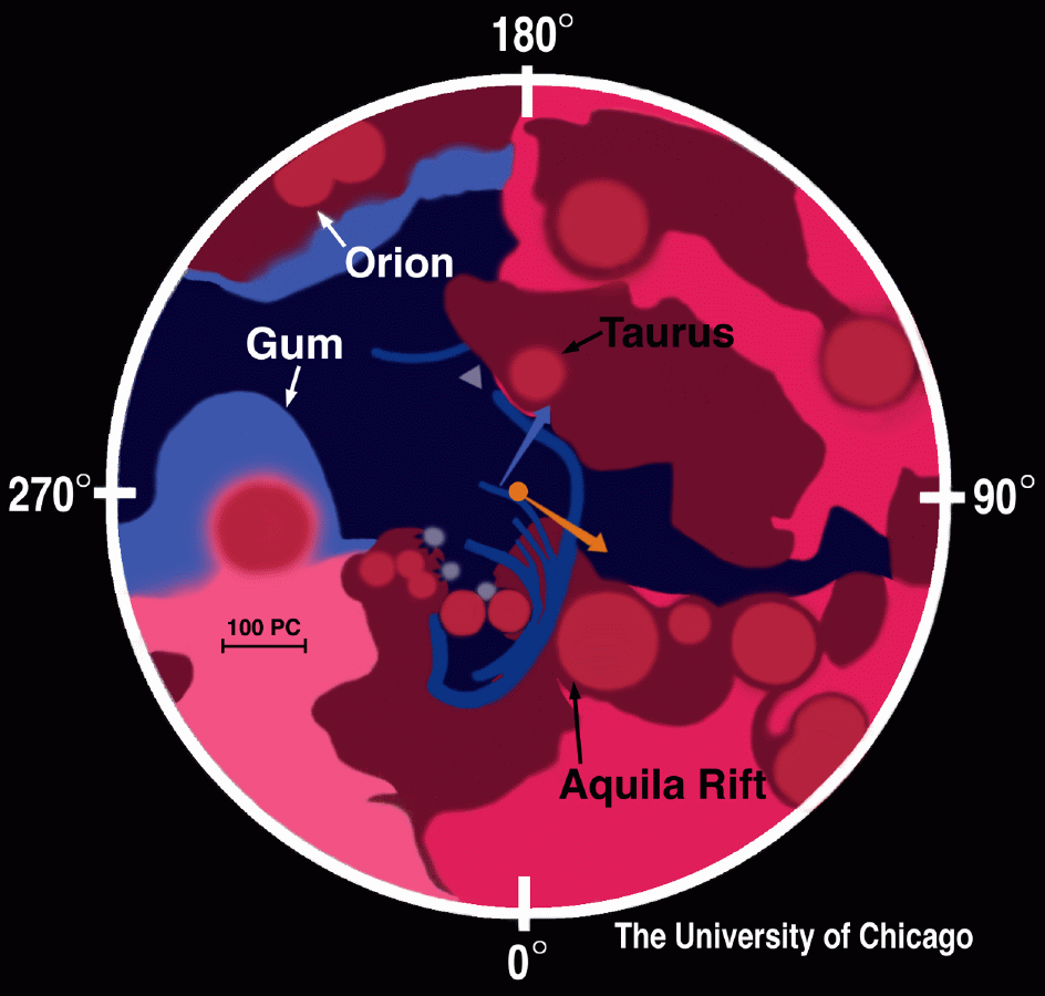 Usted está aquí. El punto naranja en el dibujo en falso color representa la ubicación actual del Sol entre las nubes de gas locales en la espiral de la Vía Láctea. Estas nubes de gas son tan tenues que normalmente podemos ver a través de ellas. Burbujas casi esféricas rodean regiones de formación estelar reciente. Los filamentos púrpuras cercanos al Sol son capas de gas resultantes de la formación estelar ocurrida hace 4 millones de años en la Asociación Escorpius-Centaurus, ubicada en la parte inferior izquierda del Sol. El Sol ha estado entre brazos espirales, desplazándose a través de gas de densidad relativamente baja durante los últimos 5 millones de años. En contraste, el Sol oscila en el plano de la Vía Láctea cada 66 millones de años, y orbita el Centro Galáctico cada 250 millones de años.