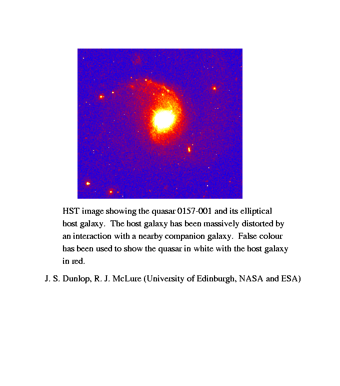 ¿Dónde viven los cuásares? Los cuásares son los objetos más brillantes del universo, tan luminosos que pueden observarse desde los confines más remotos del cosmos. Las observaciones continúan mostrando que la mayoría de los cuásares están rodeados por una mancha nebulosa relativamente tenue. Los astrónomos intentan determinar la naturaleza de estas manchas. La imagen en falso color presentada aquí muestra un cuásar central inmerso en una inusual galaxia elíptica. Dicha galaxia está siendo distorsionada gravitacionalmente por una galaxia vecina. Evidencias recientes indican que la mayoría de los cuásares se encuentran cerca de los centros de grandes galaxias elípticas, incluso aquellos cuásares en los que anteriormente no se había podido identificar ninguna galaxia huésped. Se cree que los propios cuásares resultan de la caída de materia hacia agujeros negros supermasivos.
