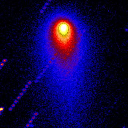 Los cometas se desplazan contra un campo de estrellas de fondo. Su movimiento aparente es lento, pero un seguimiento cuidadoso revela sus órbitas, lo que permite identificar a estos visitantes del sistema solar interior como viejos o nuevos conocidos. Recientemente, un nuevo cometa, designado 1998 H1, fue descubierto por el observador Patrick L. Stonehouse, de Wolverine, Michigan, EE. UU., y fue anunciado el 26 de abril. Con una magnitud de 10, el cometa Stonehouse es demasiado tenue para ser visto a simple vista, pero actualmente es un objeto muy popular entre los observadores de cometas provistos de telescopio. Esta imagen en falso color del cometa Stonehouse fue tomada el 1 de mayo en el Observatorio Limber y es un compuesto de 8 exposiciones de 60 segundos cada una. La secuencia de exposiciones se realizó con el telescopio siguiendo las estrellas de fondo. Las imágenes individuales fueron luego alineadas sobre el cometa y sumadas. Debido al movimiento relativo del cometa, la exposición múltiple combinada muestra trayectorias de imágenes estelares progresivamente desplazadas, pero captura con nitidez la coma del cometa y su tenue y difusa cola.