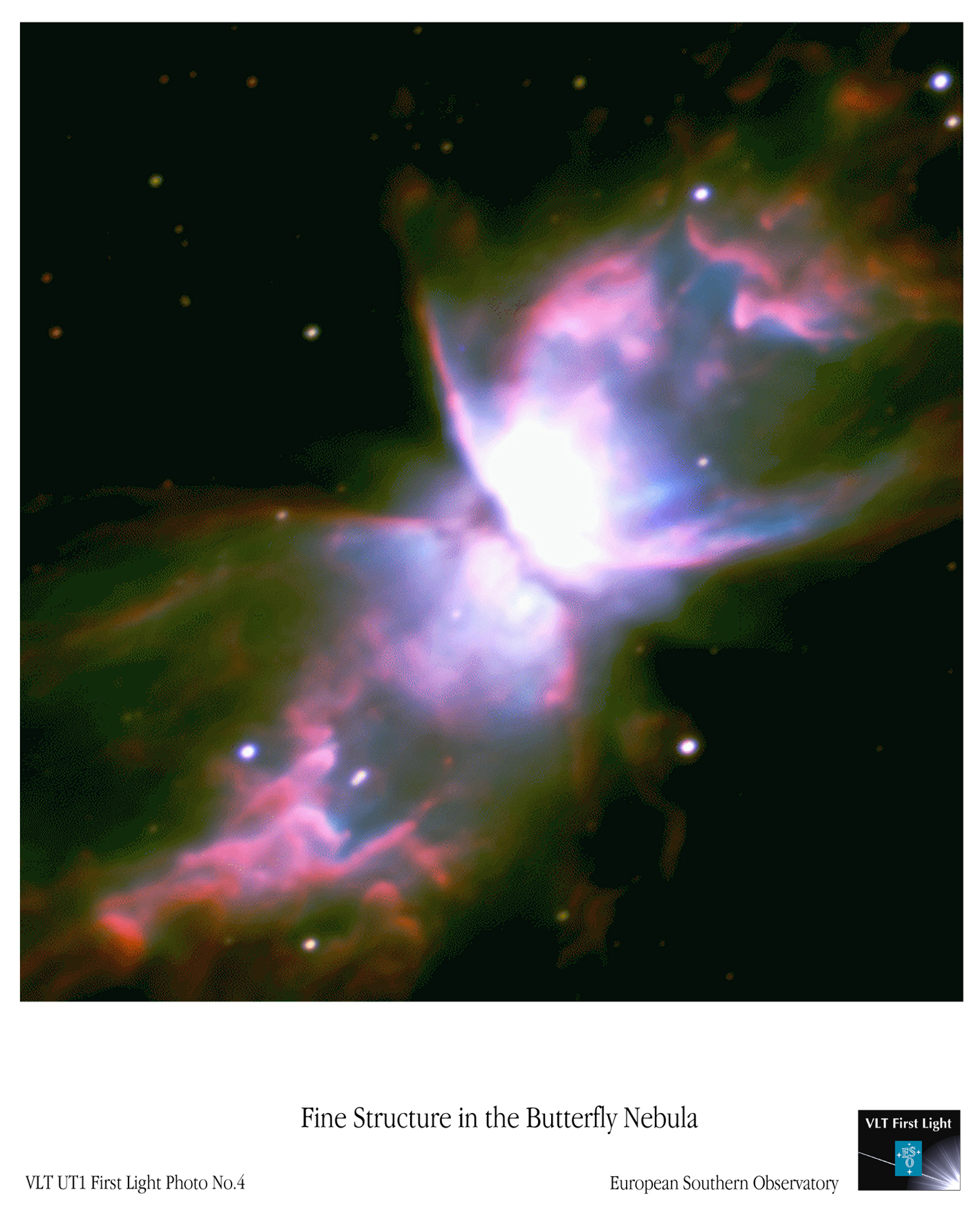 La Nebulosa Mariposa tiene apenas miles de años de antigüedad. A medida que la estrella central de un sistema binario envejeció, expulsó sus capas externas de gas mediante un intenso viento estelar. El núcleo estelar restante es tan caliente que ioniza el gas previamente eyectado, provocando que este brille. Los diferentes colores de esta nebulosa planetaria están determinados por pequeñas diferencias en su composición. Esta nebulosa bipolar continuará brillando intensamente solo por unos pocos miles de años más, tras los cuales su estrella central se apagará y se convertirá en una enana blanca. La imagen superior es una de las primeras tomadas por el Very Large Telescope (VLT), un nuevo telescopio de 8,2 metros ubicado en Chile.