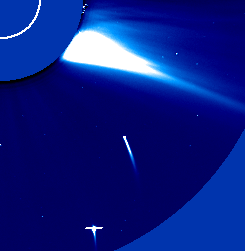 Esta animación de cuatro fotogramas (cortesía de D. Biesecker) muestra dos cometas describiendo arcos hacia un fatal y ardiente encuentro con el Sol. Estas imágenes de descubrimiento fueron registradas por el instrumento LASCO a bordo del observatorio solar espacial SOHO los días 1 y 2 de junio. Una porción del disco ocultador circular de LASCO —que bloquea la cegadora luz solar directa— es visible en la esquina superior izquierda, junto con una brillante región de viento solar que se extiende hacia la derecha. Como referencia de escala, el tamaño y la posición del borde solar están delineados por el cuarto de círculo blanco sobre el disco ocultador. Los cometas rasasoles se aproximan desde abajo y presentan colas visibles. La coma del cometa inferior es suficientemente brillante como para producir una mancha horizontal en la imagen digital, mientras que la cola del cometa superior crece de forma espectacular a medida que se acerca al Sol. La pareja son «gemelos» o al menos «hermanos» en el sentido de que ambos son, con toda probabilidad, miembros de una familia de cometas que se cree surgió de la fragmentación de un único cometa progenitor de gran tamaño. Los miembros de la familia de cometas rasasoles pueden pasar a menos de 400.000 millas de la superficie solar, y muchos, como este par, no sobreviven al encuentro.