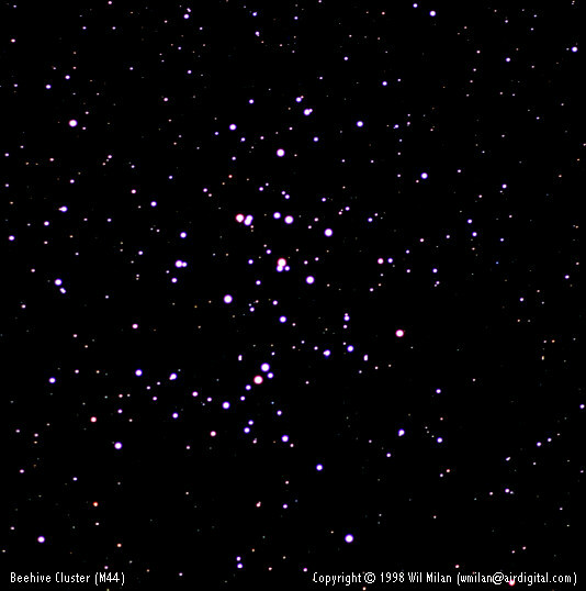 M44 is a prominent open cluster of stars. Nicknamed Praesepe and "The Beehive", it is one of the few open clusters visible to the unaided eye. M44 was thought to be a nebula until Galileo used an early telescope to resolve the cluster's bright blue stars. These stars are visible in the above image. M44, which is thought to have formed about 400 million years ago, is larger and older than most other open clusters. The Beehive Cluster lies about 580 light-years away, and spans about 10 light-years across. When viewed with a powerful telescope, hundreds of stars become visible.