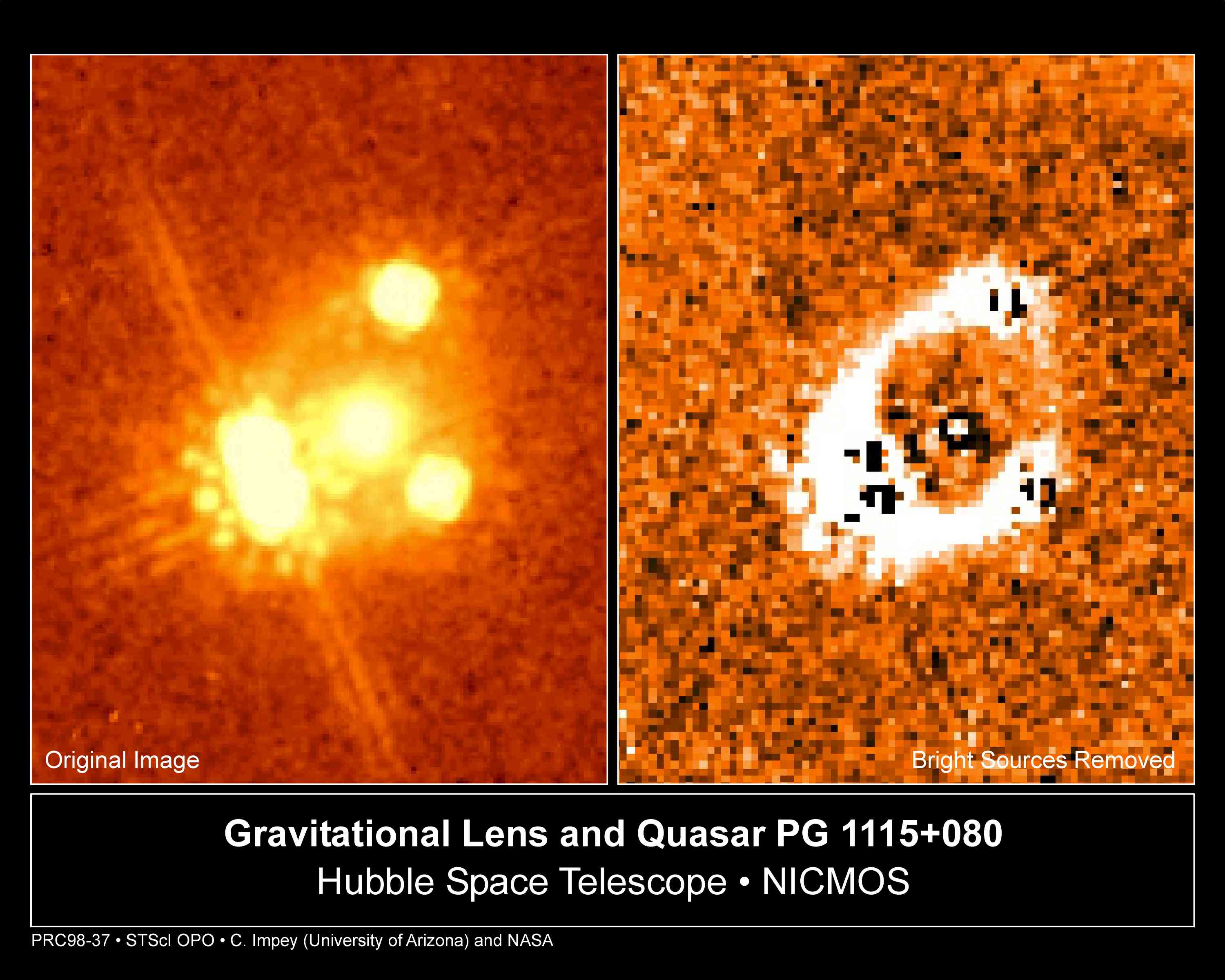 En esta maraña de cuásares y galaxias se esconde una pista sobre la tasa de expansión del universo. Un tenue resplandor visible en la imagen de la izquierda revela una galaxia elíptica normal. Directamente detrás de esta galaxia se encuentra un cuásar normal. Sin embargo, dado que el cuásar se halla exactamente detrás de la galaxia, la gravedad de esta última desvía la luz del cuásar a modo de lente, creando cuatro imágenes brillantes del mismo cuásar distante. Cuando estas imágenes se sustraen digitalmente, aparece una imagen distorsionada de la galaxia de fondo que alberga al cuásar, mostrada aquí a la derecha en blanco fantasmal. Cada imagen del cuásar registra cómo lucía este en distintos momentos del pasado, y el intervalo de tiempo entre las imágenes está influenciado por la propia tasa de expansión del universo. Asumiendo que la materia oscura en la galaxia elíptica que actúa como lente sigue la distribución de la materia visible, esta tasa de expansión puede caracterizarse mediante una constante de Hubble Ho cercana a 65 km/s/Mpc, un valor próximo al determinado por otros métodos. El análisis de esta imagen por sí sola arroja poca luz sobre si la geometría global del universo se ve afectada por una constante cosmológica.