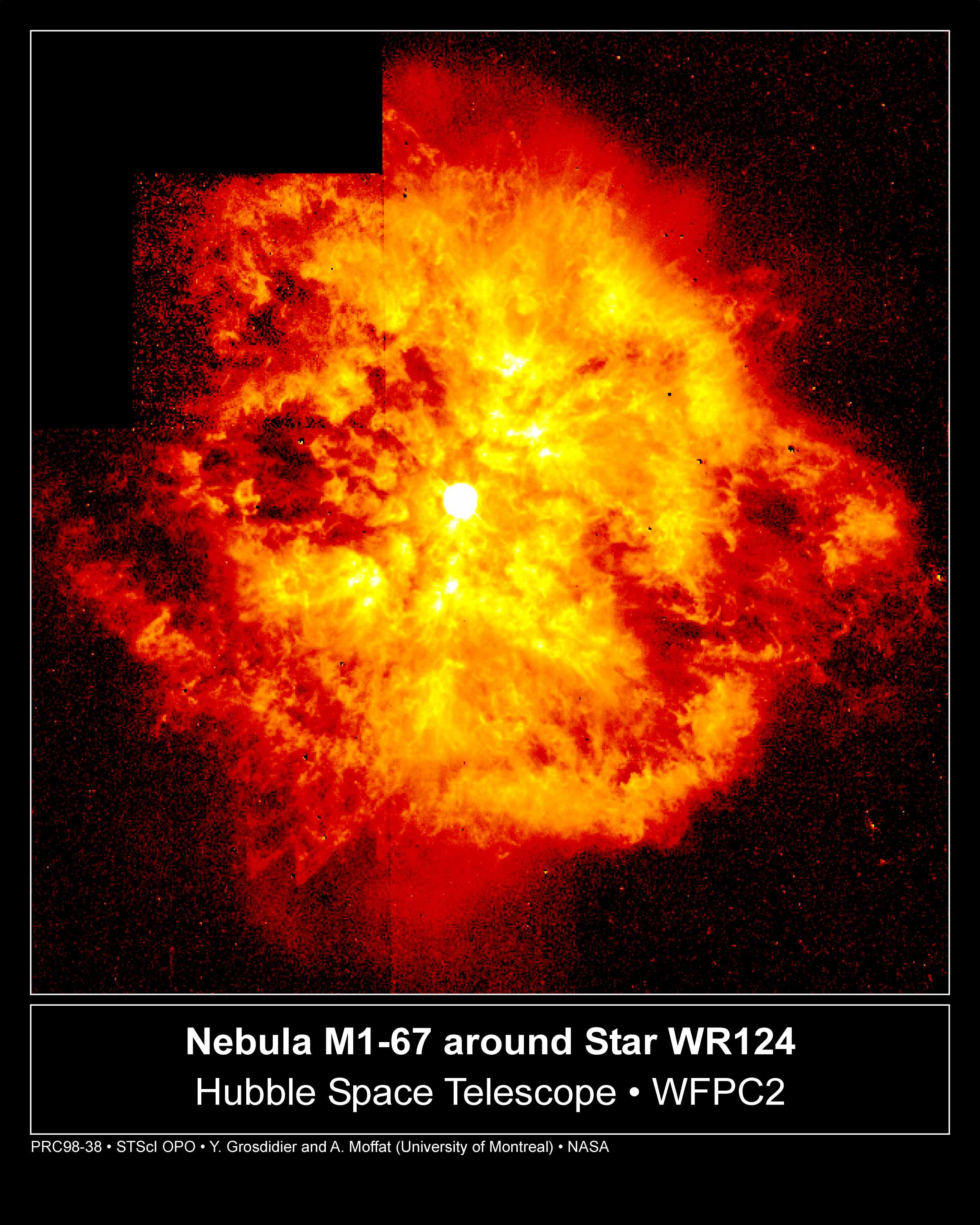 Algunas estrellas explotan en cámara lenta. Las raras y masivas estrellas Wolf-Rayet son tan turbulentas y calientes que se están desintegrando ante nuestros telescopios. Glóbulos de gas incandescente, cada uno con más de 30 veces la masa de la Tierra, son expulsados por un violento viento estelar. La estrella Wolf-Rayet WR124, visible cerca del centro de la imagen, está creando así la nebulosa circundante conocida como M1-67. El motivo por el cual esta estrella ha estado destruyéndose lentamente durante los últimos 10.000 años permanece sin explicación. WR124 se encuentra a 15.000 años-luz de distancia, en dirección a la constelación de Sagitta.
