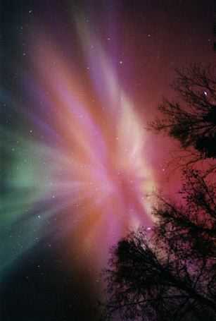 On some nights the sky is the most interesting show in town. This picture captures a particularly active and colorful display of aurora that occurred a month ago high above Alaska. Auroras are more commonly seen by observers located near the Earth's poles. Aurora light results from solar electrons and protons striking molecules high in the Earth's atmosphere. Planetary aurora activity can sometimes be predicted after particularly active solar coronal mass ejections.