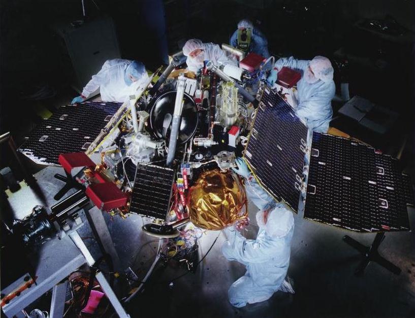 These technicians are working on the solar-paneled Mars Polar Lander - yet another robotic spacecraft scheduled to invade the red planet. Mars Polar Lander is part of a series of missions focusing on a search for evidence of past or present life. Successfully launched atop a Delta II rocket on January 3rd, it should be the first to make a soft landing near Mars' South Pole. Its arrival is planned for December, springtime for the Martian Southern Hemisphere. Riding along are two separate microprobes intended to penetrate up to 2 meters beneath the soil in an attempt to directly determine if subsurface water ice is present. Mars Polar Lander will also carry another first to Mars ... a microphone.