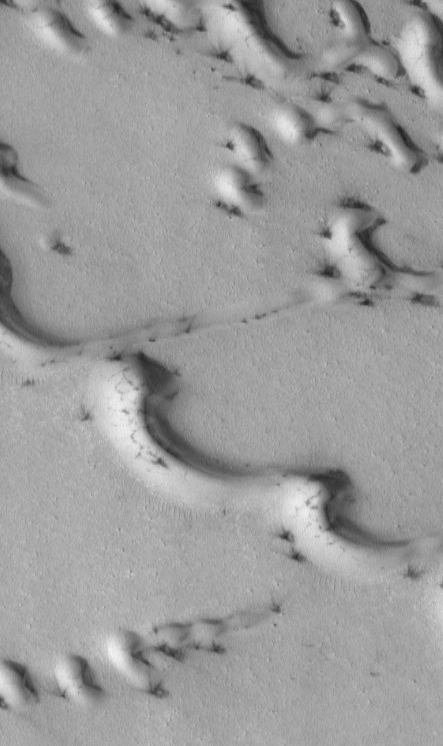 Se ha descubierto erosión eólica en Marte. Imágenes de las regiones que rodean la casquete polar norte muestran dunas de arena cubiertas de escarcha. En algunos lugares, sin embargo, esta escarcha ha sido erosionada dejando al descubierto la oscura arena subyacente. Dado que esta escarcha solo puede tener la antigüedad del invierno marciano, dicha erosión debe haber ocurrido durante el último año marciano. Una vez establecido este hecho, resulta fácil visualizar que gran parte del aspecto de la región mostrada ha sido esculpida por polvo arrastrado por el viento. Debido a que la atmósfera marciana es extremadamente tenue, una persona de pie en Marte no sería derribada por estos vientos marcianos.