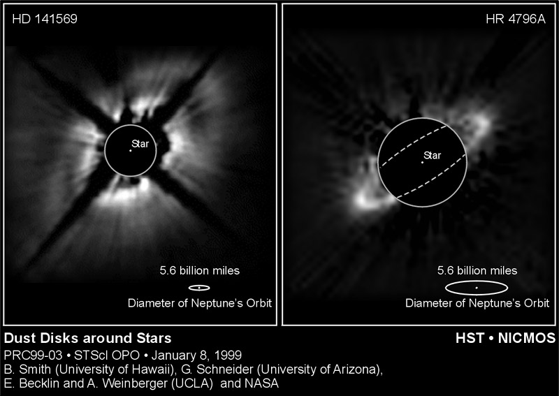 Estas imágenes del Hubble en el infrarrojo cercano de polvo que rodea estrellas jóvenes ofrecen las últimas evidencias tentadoras de planetas más allá de nuestro Sistema Solar. A la izquierda, la brecha oscura visible en el disco de polvo recuerda a una brecha similar de gran tamaño en los anillos de Saturno, que se cree fue esculpida por lunas en órbita. Por analogía, la brecha en el disco de polvo de HD 141569 podría ser el resultado, a mayor escala, de planetas en órbita que no se observan directamente. A la derecha se muestra un anillo de polvo estelar relativamente delgado, sugerente de los anillos planetarios mantenidos en su lugar por lunas en órbita. A una escala mucho mayor, este anillo alrededor de la estrella HR 4796A podría indicar también la presencia de cuerpos del tamaño de planetas en órbita, demasiado tenues para ser visibles directamente. Como referencia de distancia, la órbita de Neptuno aparece dibujada en la parte inferior derecha de cada imagen. La brillante luz estelar del centro, de intensidad abrumadora, ha sido bloqueada para revelar los tenues rasgos del polvo circunestelar.