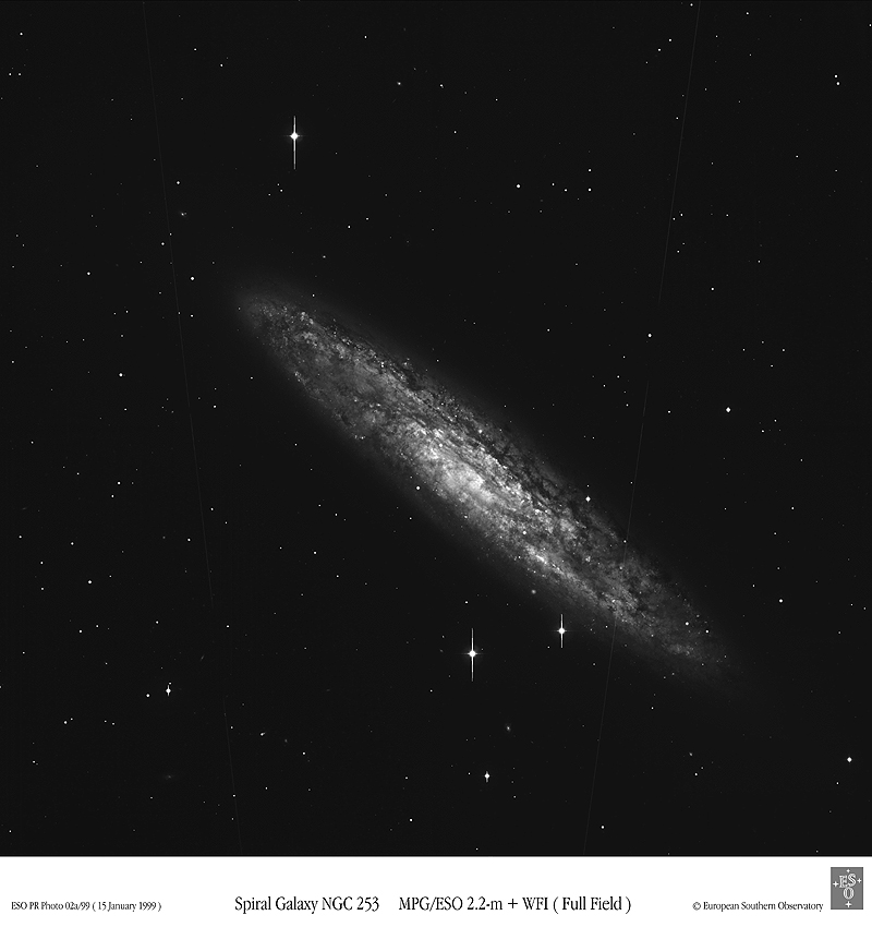 Una cámara de más de 67 millones de píxeles (elementos de imagen digital) fue utilizada para capturar esta impresionante imagen de la galaxia espiral NGC 253. Conocida como el Instrumento de Campo Amplio (WFI, por sus siglas en inglés), esta cámara es el instrumento más reciente instalado en el telescopio de 2,2 metros del Observatorio Europeo Austral en La Silla, Chile. Construida a partir de exposiciones realizadas por el WFI en diciembre de 1998, esta imagen ha sido recortada del campo completo para destacar la galaxia, y su contraste ha sido ajustado para resaltar los elegantes y sinuosos brazos espirales y los dramáticos carriles de polvo de esta fotogénica isla universo. Las estrellas brillantes del primer plano producen los pronunciados trazos verticales visibles en la imagen, mientras que versiones de mayor resolución revelan fascinantes y tenues galaxias de fondo, así como probables cúmulos globulares de estrellas asociados con NGC 253. También son visibles los tenues rastros de dos satélites artificiales. NGC 253, una espiral de tipo Sc, se encuentra a aproximadamente 8 millones de años-luz de distancia, en la constelación austral del Escultor.