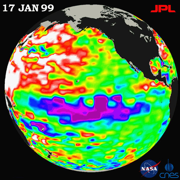 La Niña es un cambio climático temporal causado por aguas inusualmente frías en el océano Pacífico central. Las aguas frías que cubren un nivel del mar anormalmente bajo se muestran en color púrpura en la imagen en falso color tomada a mediados de enero por el satélite TOPEX/Poseidon en órbita. Este tipo de agua fría tiende a desviar los vientos a su alrededor, alterando el curso de los sistemas meteorológicos a nivel local y la naturaleza de los patrones climáticos a escala global. La Niña de este año parece haberse debilitado durante los últimos meses, lo que indica un lento retorno a condiciones estacionales más normales. Los efectos completos del episodio de El Niño precedente y del actual fenómeno de La Niña aún están siendo estudiados.