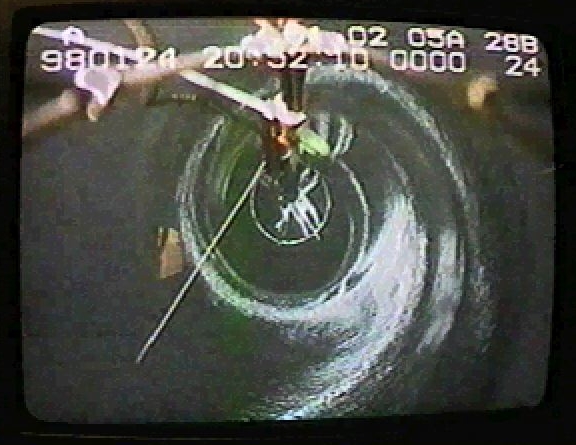 In 1996, scientists melted a hole in the bottom of the world. In fact, several holes have been melted near the South Pole, and they are now being used as astronomical observatories. Astronomers with the Antarctic Muon and Neutrino Detector Array (AMANDA) lower into each vertical lake a string knotted with basketball-sized light detectors. The water in each hole soon refroze. The detectors are sensitive to blue light emitted in the surrounding clear ice. Such light is expected from ice collisions with high-energy neutrinos emitted by objects or explosions out in the universe. The above picture was taken 750 meters below the surface looking down into the abyss. Instruments were lowered down past 2000 meters. Data from AMANDA is already being collected and analyzed.