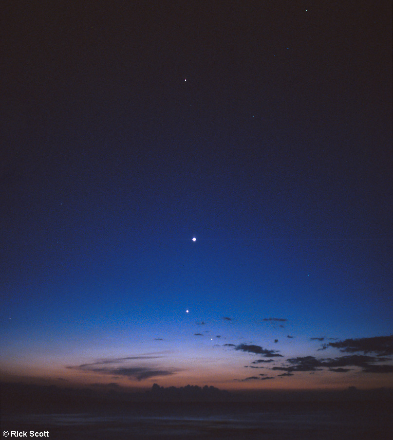 This March stargazers have been treated to eye-catching formations of bright planets in western evening skies. On March 3rd, looking toward a beautiful sunset from a beach on the Hawaiian isle of Maui, photographer Rick Scott recorded this fleeting, four-planet "hockey stick" array. Mercury, closest to the horizon and immersed in fading sunlight, is easily visible between silhouetted clouds. To the left and up in the deepening blue is Jupiter with a brilliant Venus above and Saturn shining in the darkened sky near the top of the image. The planets are seen to lie close to the ecliptic - the apparent path of the sun - which is nearly perpendicular to the horizon for Hawaiian latitudes at this time of year.