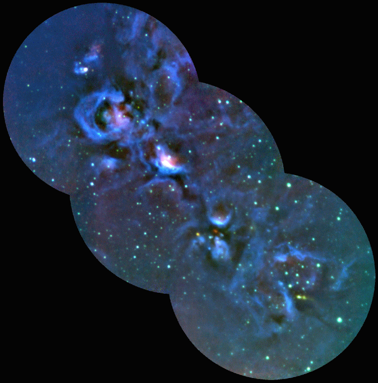 NGC 6334 is a cloud of gas and dust that appears to be forming massive stars. At 5500 light-years away, the Bear Claw Nebula, as it has also been dubbed, is more than three times as distant as the Orion Nebula, but still close enough for detailed study. The Bear Claw Nebula can be found towards the constellation of Scorpius. In visible light, ionized gas makes NGC 6334 look quite red. The above false-color photograph, however, was taken in infrared light. There, the glow of starlight absorbing dust is more apparent (depicted in blue). Current research indicates that the bright sources are very young and massive stars. These stars emit light so energetic and intense that it destroys fine grains of dust in their immediate vicinity, creating an abundance of ionized gas (depicted in red).