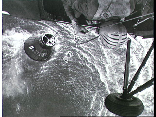Today, the space capsule Liberty Bell 7 rests about 3 miles below the surface of the Atlantic Ocean. But on July 21, 1961, astronaut Virgil I. "Gus" Grissom rode this tiny craft 118 miles above the Earth to become the second American in space. Grissom's flight was suborbital - like fellow Mercury astronaut Alan Shepard's first flight - however his capsule was different, with a window, a new manual spacecraft control system, and an explosive hatch. Unfortunately, after Grissom brought Liberty Bell 7 to a successful splash down in the planned area, the hatch blew prematurely and rough seas began to flood the capsule. While Grissom was able to get out, the military recovery helicopter could not lift the waterlogged spacecraft. This dramatic picture was taken from the helicopter shortly before Liberty Bell 7 was released and sank.