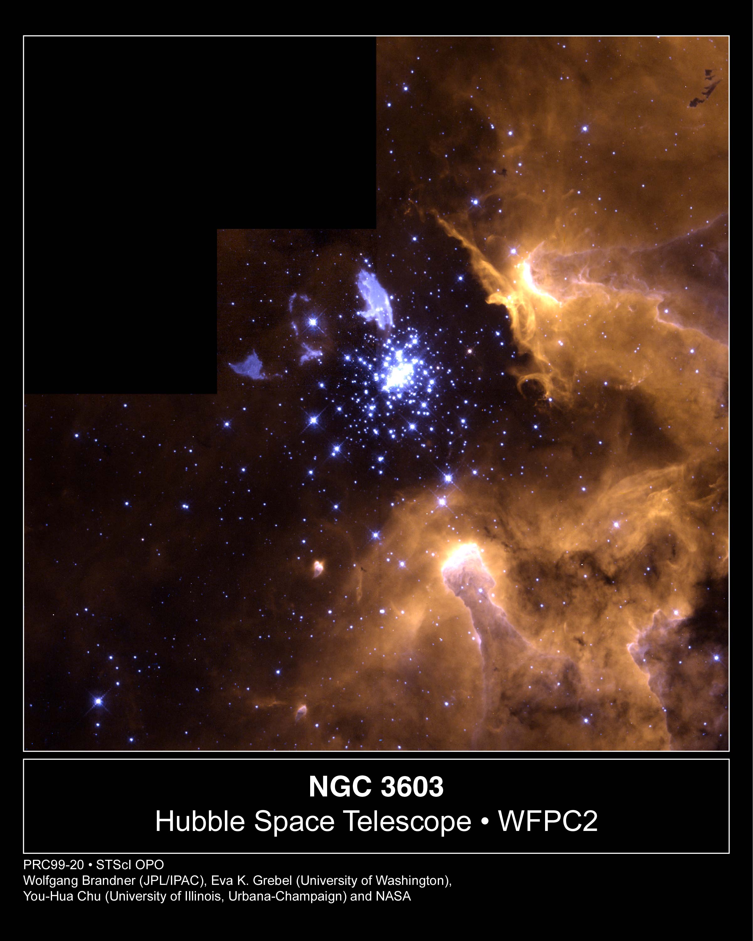 De principio a fin, distintas etapas de la vida de una estrella aparecen en esta extraordinaria imagen del Telescopio Espacial Hubble del entorno de la nebulosa de emisión galáctica NGC 3603. Para el comienzo, llamativas "columnas" de hidrógeno luminoso a la derecha señalan estrellas recién nacidas que emergen de sus densas guarderías gaseosas. Menos llamativas, las nubes oscuras o "glóbulos de Bok" en la esquina superior derecha corresponden probablemente a una etapa aún más temprana, previa a su colapso para formar estrellas. En el centro de la imagen se encuentra un cúmulo de brillantes y calientes estrellas azules, cuyos intensos vientos y radiación ultravioleta han despejado el material circundante. Masivas y jóvenes, agotarán pronto su combustible nuclear. Próxima al final de su vida, la brillante estrella supergigante Sher 25 se observa por encima y a la izquierda del cúmulo, rodeada por un anillo luminoso y flanqueada por concentraciones de gas expulsado. La estructura anular recuerda a la Supernova 1987a, y la propia Sher 25 podría estar a tan solo unos pocos miles de años de su propio y devastador desenlace. ¿Pero qué ocurre con los planetas? Obsérvense los dos objetos en forma de lágrima situados debajo del cúmulo, hacia la parte inferior de la imagen. Aunque de mayor tamaño, estas nebulosas de emisión son similares a los presuntos discos protoplanetarios (proplyds) que rodean estrellas en la Nebulosa de Orión.