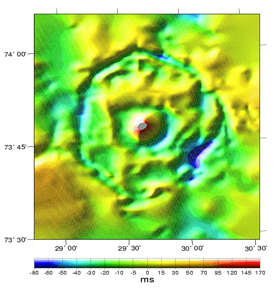 The stark surface of Earth's moon is pocked with large craters, records of a history of fierce bombardment by the solar system's formative debris. It may be difficult to imagine, but nearby planet Earth itself has endured a similar cosmic pounding, though oceans, weathering, and geological activity have removed or hidden many of the telltale scars. For example, this false color image produced from seismic data shows a recently discovered ringed structure about 24 miles wide on the floor of the Barents Sea. It is most probably the result of the impact, roughly 150 million years ago, of a mile or so wide asteroid-like body. Estimates indicate that the energy released in the impact could have been as high as a million megatons of TNT, resulting in immense earthquakes and tidal waves. Drawing on Norse mythology, the crater has been aptly named Mjølnir - Thor's hammer.
