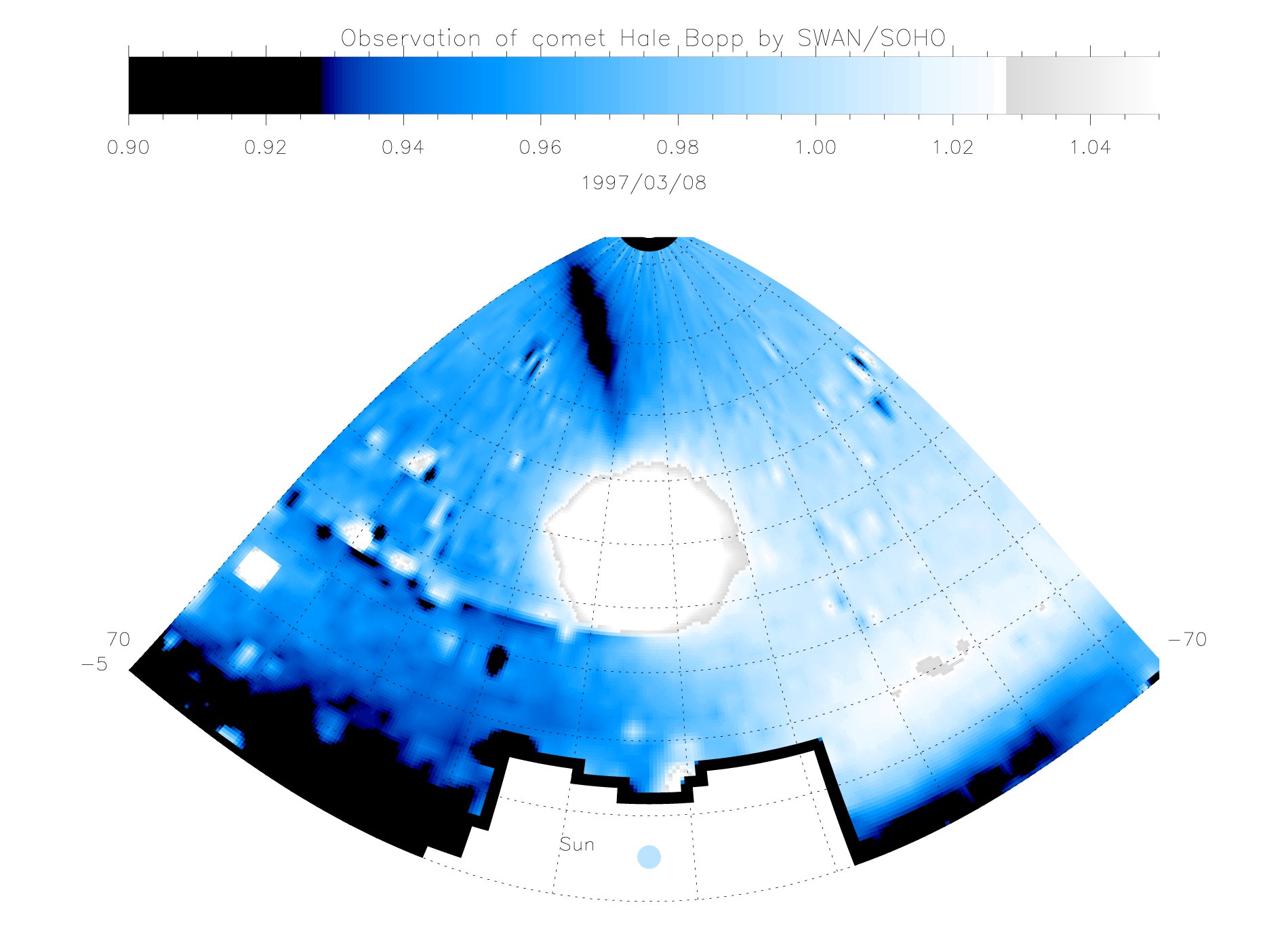 El cometa Hale-Bopp, el Gran Cometa de 1997, fue posiblemente el cometa más observado en la historia, visible incluso desde cielos urbanos con alta contaminación lumínica. Los astrónomos informan ahora que este magnífico cometa proyectó también una sombra contra el resplandor de la neblina ultravioleta del sistema solar. Esta imagen en falso color representa una porción del cielo observada por el instrumento SWAN (Solar Wind ANisotropy) a bordo del observatorio espacial SOHO. Registrada el 8 de marzo de 1997, muestra una neblina general de luz ultravioleta solar dispersada por hidrógeno interestelar. El Sol se encuentra por debajo del centro inferior de la imagen recortada, y la gran mancha brillante corresponde a la luz ultravioleta solar dispersada por la nube de gas hidrógeno que rodea el núcleo de Hale-Bopp. Justo arriba y a la izquierda se aprecia una franja oscura, amplia y difusa: la sombra de 150 millones de kilómetros de longitud producida por las regiones más densas de esta envoltura de hidrógeno. ¿Por qué están rodeados de hidrógeno los cometas? El hidrógeno proviene de la disociación del vapor de agua (H₂O) liberado cuando el núcleo del cometa se aproxima al Sol. Estas observaciones indican que el núcleo de Hale-Bopp producía aproximadamente 300 toneladas de agua por segundo.