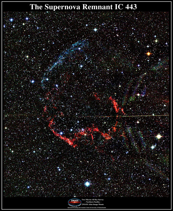 Hace aproximadamente 8000 años, una estrella de nuestra Galaxia explotó. Los humanos de la antigüedad podrían haber notado la supernova como una estrella temporal, pero los humanos modernos pueden ver incluso hoy la capa de gas en expansión. En la imagen infrarroja de falso color del remanente de supernova IC 443 que se muestra arriba, el azul indica gas en expansión donde la emisión está dominada por átomos de hierro excitados. De particular interés, sin embargo, son los filamentos de IC 443 coloreados en rojo, ya que están impactando una nube molecular que de otro modo sería normal. En esta región, la emisión producida por hidrógeno molecular excitado por ondas de choque está permitiendo a los astrónomos estudiar cómo el gas de la supernova en rápido movimiento afecta la formación estelar en la nube. Adicionalmente, los astrónomos teorizan que el impacto acelera algunas partículas hasta velocidades cercanas a la de la luz. La línea horizontal que atraviesa la imagen no forma parte de la nebulosa.