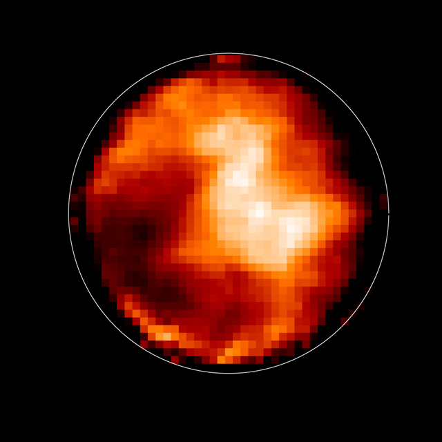 Si navegara por los mares de hidrocarburos de Titán, tenga cuidado con la lluvia de gasolina. Tal podría ser el aviso de viaje que se emitiría el próximo milenio para los aventureros que visiten Titán, la luna más grande de Saturno. La semana pasada se publicaron imágenes de la superficie de Titán obtenidas con el telescopio Keck de 10 metros, que muestran los detalles más finos jamás resueltos. Al penetrar en la espesa atmósfera de smog de Titán con luz infrarroja, se hicieron visibles complejas estructuras interpretadas como océanos, glaciares y roca. La imagen infrarroja de alta resolución que se muestra arriba fue posible gracias a una técnica de desenfoque llamada interferometría de speckle. La sonda interplanetaria Cassini llegará a Saturno y Titán en 2004 para explorar mejor este inusual mundo.