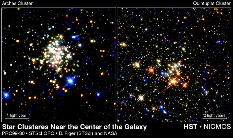 Bright clusters of stars form and disperse near the center of our Galaxy. Four million years ago the Quintuplet Cluster, pictured above, formed and is now slowly dispersing. The Quintuplet Cluster is located within 100 light-years of the Galactic center, and is home to the brightest star yet cataloged in our Galaxy: the Pistol Star. Objects near our Galactic center are usually hidden from view by opaque dust. This recently-released picture was able to capture the cluster in infrared light, though, with the NICMOS camera onboard the orbiting Hubble Space Telescope. The young Quintuplet Cluster is one of the most massive open clusters yet discovered, but still much less massive than the ancient globular clusters that orbit in the distant halo. Some of the bright white stars visible above may be on the verge of blowing themselves up in a spectacular supernova.