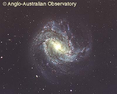M83 is a bright spiral galaxy that can be found with a small telescope in the constellation of Hydra. It takes light about 15 million years to reach us from M83. M83 is quite a typical spiral - much like our own Milky Way Galaxy. Spiral galaxies contains many billions of stars, the youngest of which inhabit the spiral arms and glow strongly in blue light. Dark dust lanes are mixed in with the stars and help define M83's marked spiral structure. The space between the spiral arms is also filled with stars - but stars that are typically more dim and red. The stars and gas in spiral arms seem to be responding to much more mass than is visible here, implying that galaxies are predominantly composed of some sort of dark matter. Finding the nature of this dark matter remains one of the great challenges of modern science.