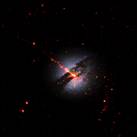 Con una extensión de más de 25.000 años-luz, comparable a la distancia del Sol al centro de nuestra propia galaxia Vía Láctea, un chorro cósmico visible en rayos X emerge con gran energía desde el centro de Centaurus A. A tan solo 10 millones de años-luz de distancia, Centaurus A es una gigantesca galaxia elíptica y la galaxia activa más cercana a la Tierra. Esta imagen compuesta ilustra la mezcla de gas, polvo y estrellas visible en una imagen óptica de Cen A superpuesta sobre una nueva imagen registrada por el Observatorio de Rayos X Chandra en órbita. Los datos de rayos X se muestran en rojo. Las teorías actuales sostienen que el chorro brillante en rayos X es producido por electrones acelerados hasta energías extremadamente altas a lo largo de enormes distancias. La fuente de energía del chorro es probablemente un agujero negro con aproximadamente 10 millones de veces la masa del Sol, coincidente con el punto brillante en rayos X ubicado en el centro de la galaxia. Sorprendentemente, mientras parte del material en las proximidades del agujero negro cae hacia su interior, otra parte es expulsada hacia el exterior en forma de chorros energéticos. Los detalles de este generador de energía cósmico pueden explorarse con los datos de rayos X del Chandra.