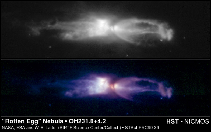 Not all evolving stars eject gas clouds that look like people. OH231.8+4.2 was a star much like our Sun that ran out of nuclear fuel to fuse in its core. It has therefore entered the planetary nebula phase, where it throws off its outer atmosphere into space leaving a core that will become a white dwarf star. Every Sun-like star creates a different planetary nebula though, and OH231.8+4.2's looks eerily like a person! Spectacular jets of streaming gas can be seen in this recently released photograph by the Hubble Space Telescope. The gas cloud has been dubbed the Rotten Egg Planetary Nebula because it contains unusually high amounts of sulfur, an element that, when combined with other elements, can smell like a rotten egg. This young planetary nebula will likely change its appearance over the next few thousand years and eventually disperse.