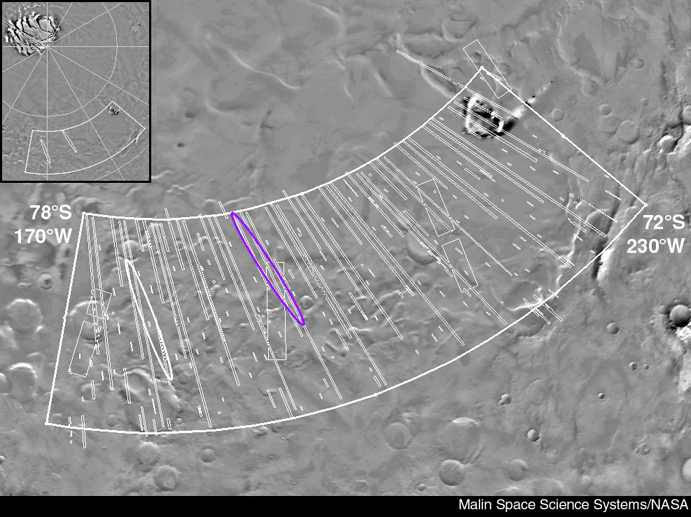 El más reciente explorador proveniente de la Tierra, la sonda Mars Polar Lander (MPL), tiene programado su aterrizaje en la superficie del Planeta Rojo el viernes 3 de diciembre. Si todo transcurre según lo previsto, el explorador robótico desplegará un paracaídas, extenderá las patas de aterrizaje, encenderá los propulsores y se posará en medio de llanuras onduladas de intrigante terreno estratificado, cerca del Polo Sur marciano. En esta imagen orbital, una cuadrícula se superpone sobre la región de aterrizaje, con el sitio objetivo indicado por un óvalo púrpura de aproximadamente 200 kilómetros de longitud por 20 kilómetros de anchura. Un sitio de aterrizaje secundario se muestra como un óvalo blanco, mientras que en la esquina superior izquierda un recuadro ilustra la zona en relación con el polo. El terreno estratificado de esta región polar permitirá, con suerte, que los instrumentos del MPL registren un historial de cambios climáticos en la historia marciana, de manera similar a la lectura de los anillos de los árboles o de las capas de un núcleo de hielo. Antes del aterrizaje, el MPL liberará dos microsondas diseñadas para penetrar el suelo en busca de hielo de agua. El Mars Polar Lander también transportará un pequeño micrófono marciano, el Mars Microphone.
