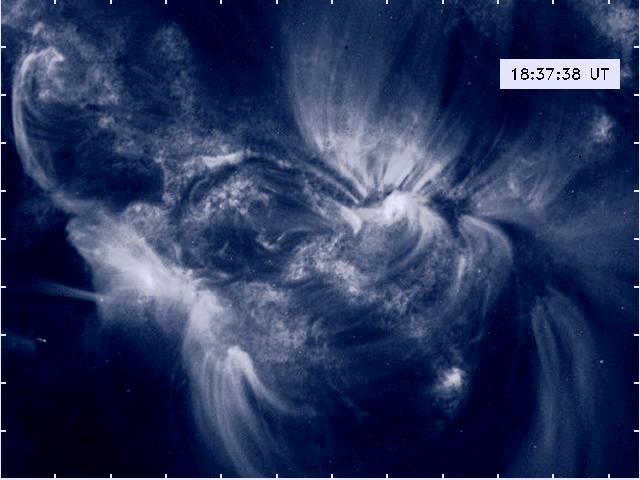 Descubierta en imágenes recientes de primer plano del Sol obtenidas por la nave espacial TRACE (Transition Region And Coronal Explorer) de la NASA, esta sustancia de apariencia esponjosa tiene una temperatura de aproximadamente 1,1 millones de grados Celsius... y ha sido denominada "Musgo Solar". La imagen de falso color de TRACE que se muestra arriba fue registrada en luz ultravioleta extrema el 18 de octubre. Muestra el musgo solar asociado con lazos de plasma magnético caliente que se arquean sobre una de las regiones activas del Sol. El musgo corresponde al material difuso de color azul oscuro y blanco que parece cubrir las áreas entre las brillantes bases blancas de los lazos. Se ha observado que el musgo solar se expande, persistiendo típicamente durante decenas de horas, y puede formarse rápidamente tras una llamarada solar. El musgo solar no se encuentra únicamente en el lado norte del Sol, sino que, como regla general, parece situarse por encima de la fotosfera o superficie visible, en la región de transición de la atmósfera solar. Complejo y previamente desconocido, este fenómeno podría proporcionar una pista sobre el largo tiempo buscado mecanismo responsable del calentamiento de la atmósfera exterior del Sol.